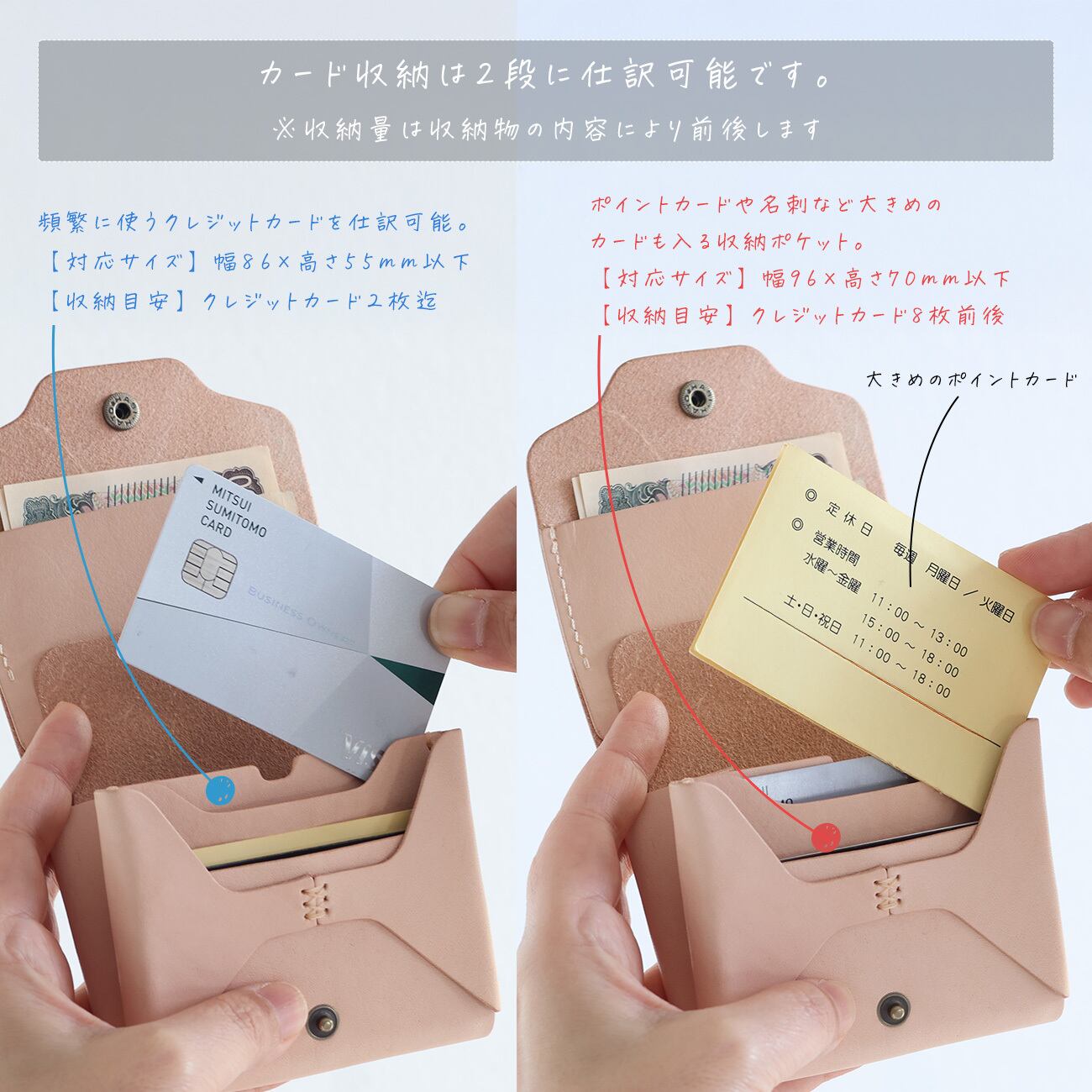 1段目はクレジットカード2枚対応、2段目はクレジットカードが約8枚前後収納可能です。収納部の幅内寸が広くなり、おおきめのポイントカードも入る仕様です。