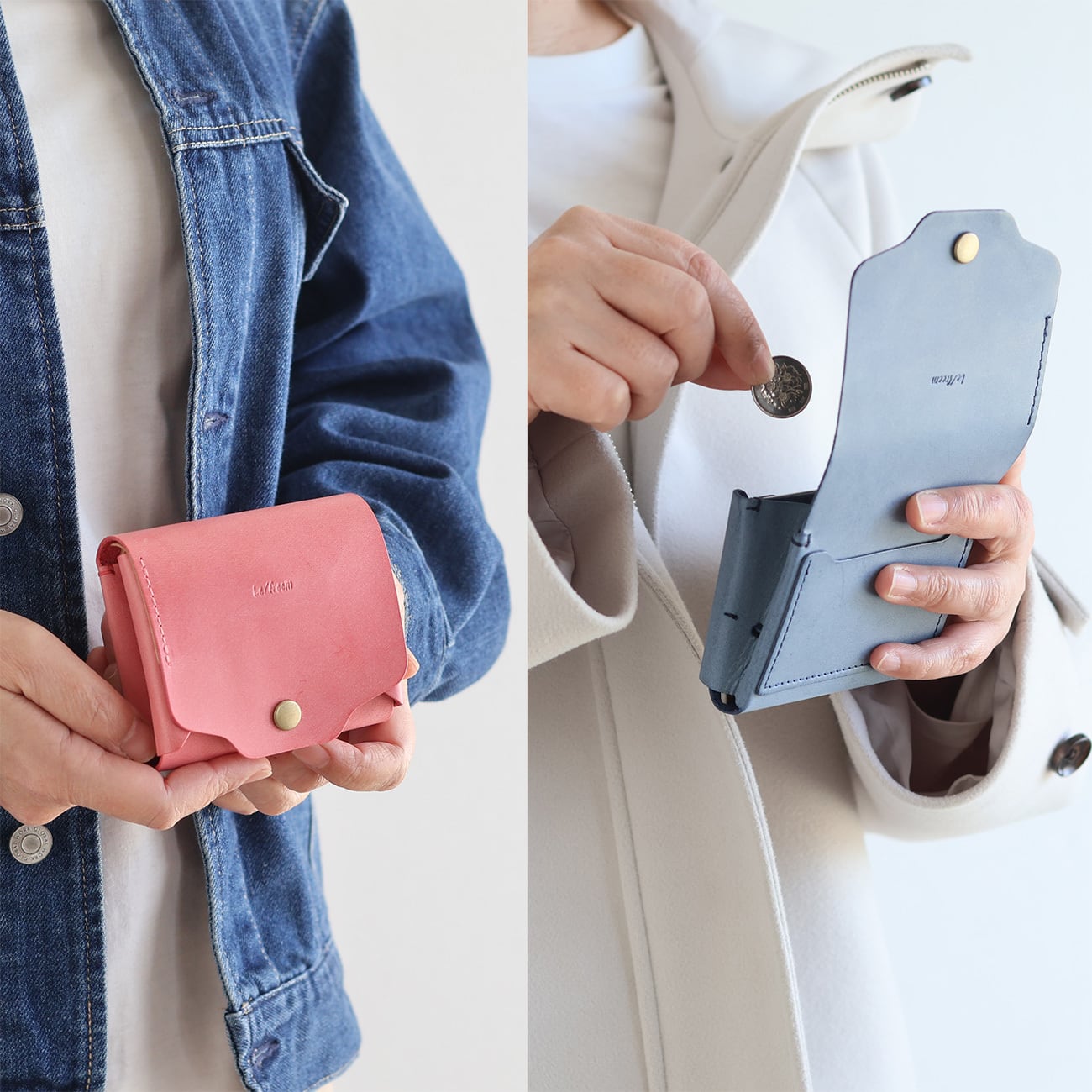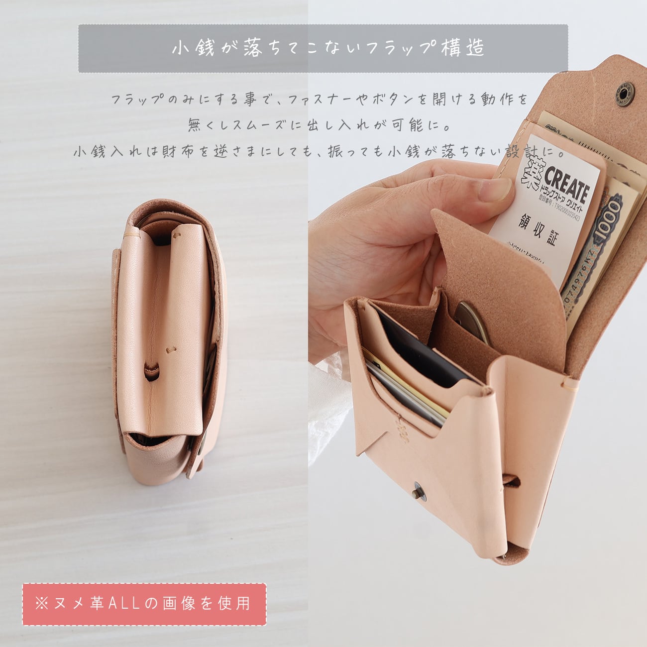 小銭入れはフラップのみにする事で、ファスナーやボタンを開ける動作を無くしスムーズに出し入れが可能です。財布を逆さまにしても、振っても小銭が落ちない設計になっています。