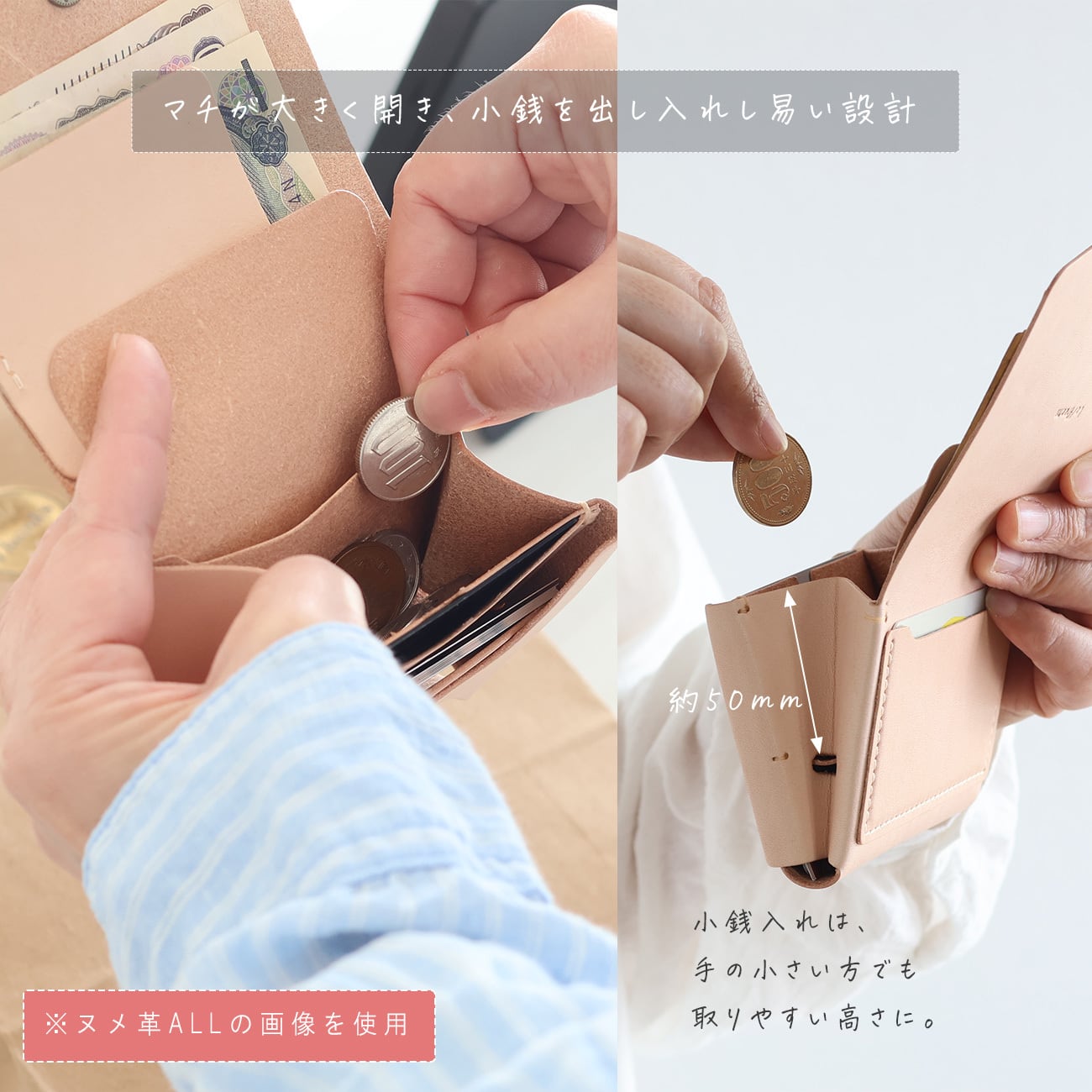 小銭入れの深さを浅くし、手の小さい方でも取り出しやすい設計に。