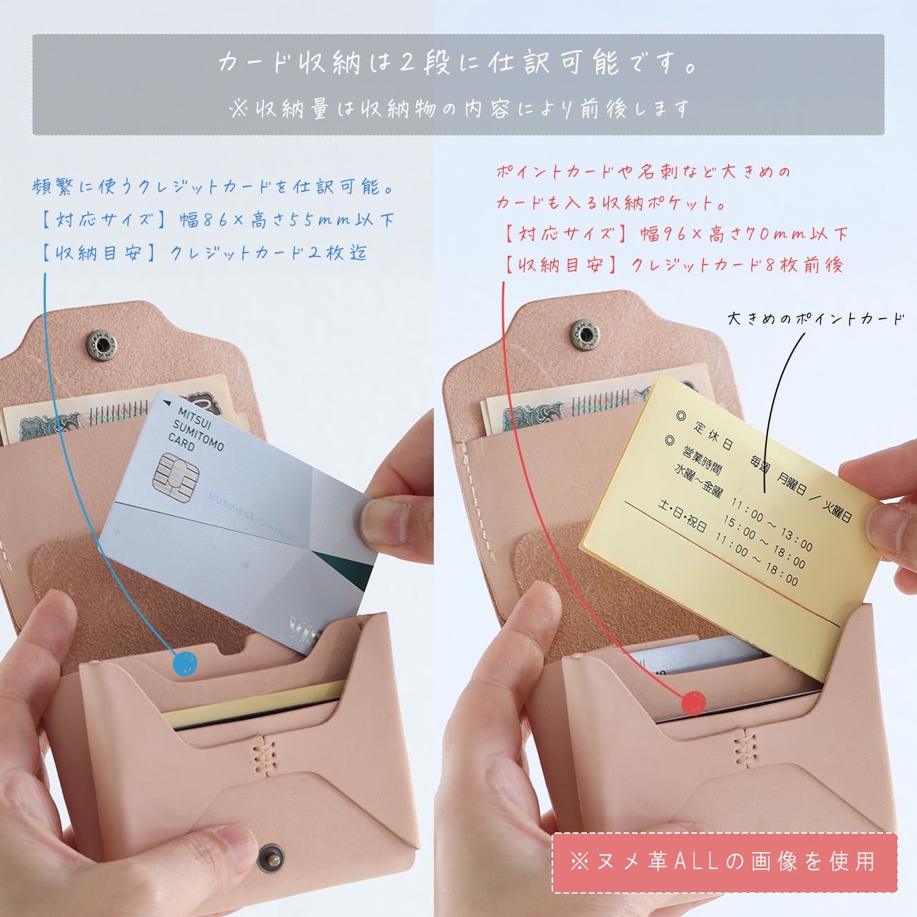 1段目はクレジットカード2枚対応、2段目はクレジットカードが約8枚前後収納可能です。収納部の幅内寸が広くなり、おおきめのポイントカードも入る仕様です。