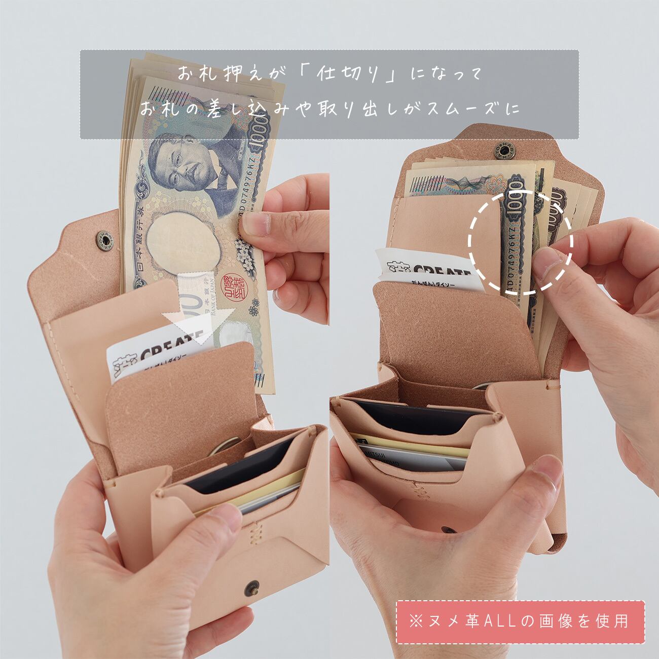 札入れには仕切りがあり、レシート等と仕分けが可能です。